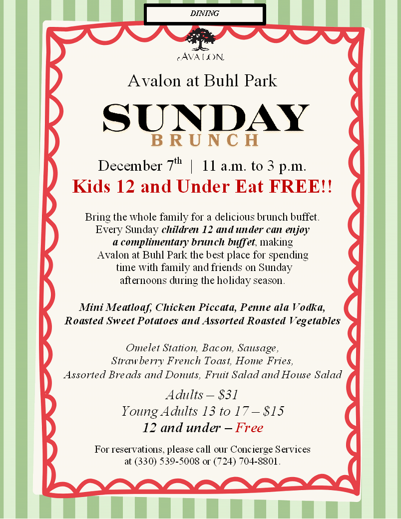 Sunday Brunch December 7th at Avalon at Buhl Park