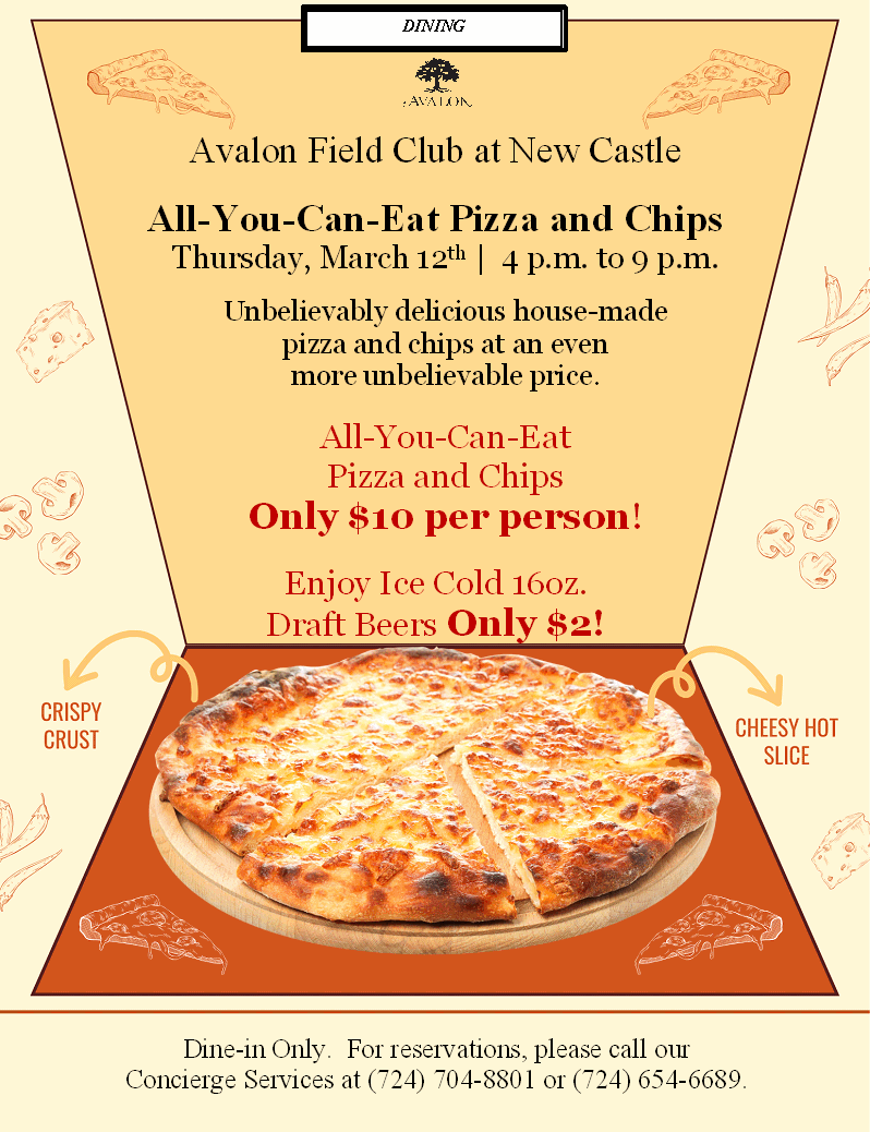 Mar 12 9 All-You-Can-Eat Pizza and Chips Thursday, March 12th at Avalon Field Club at New Castle By Avalon | Dining