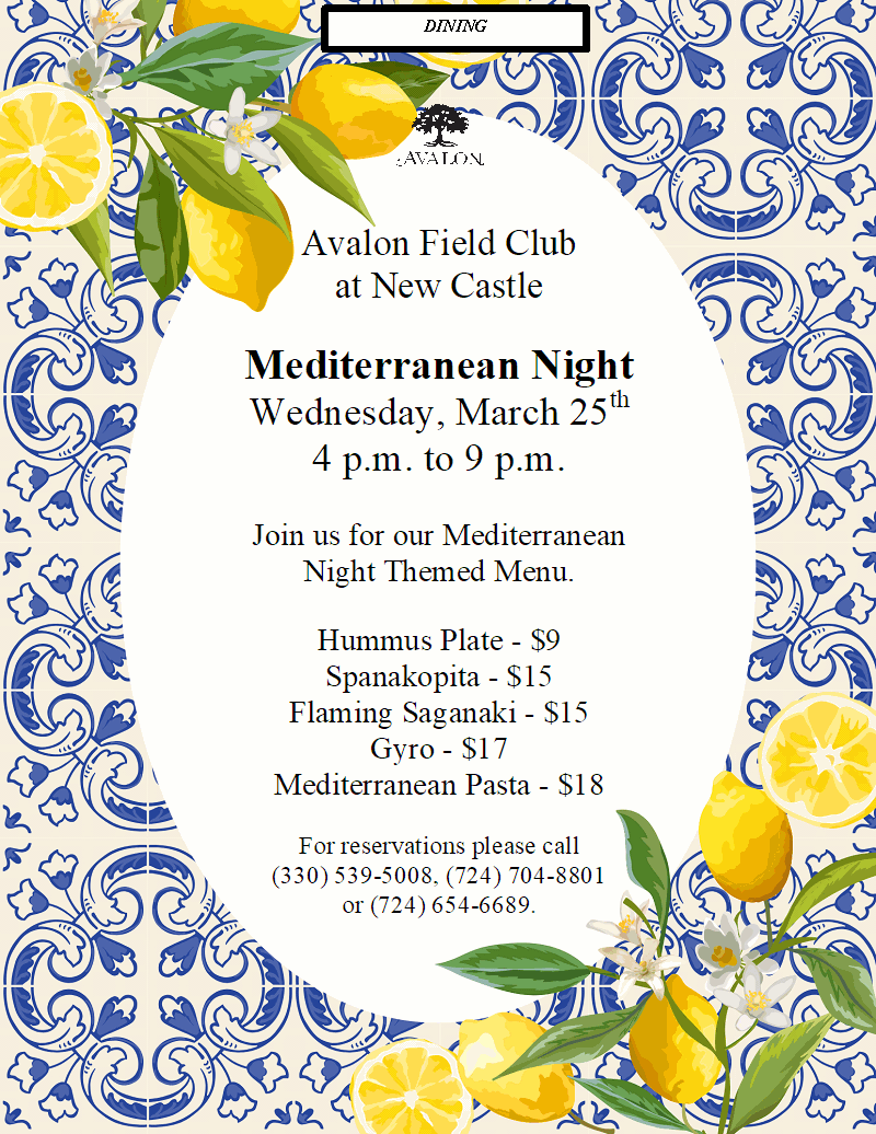 Mar 25 9 Mediterranean Night Wednesday. March 25th By Avalon | Dining Avalon Field Club at New Castle Read More