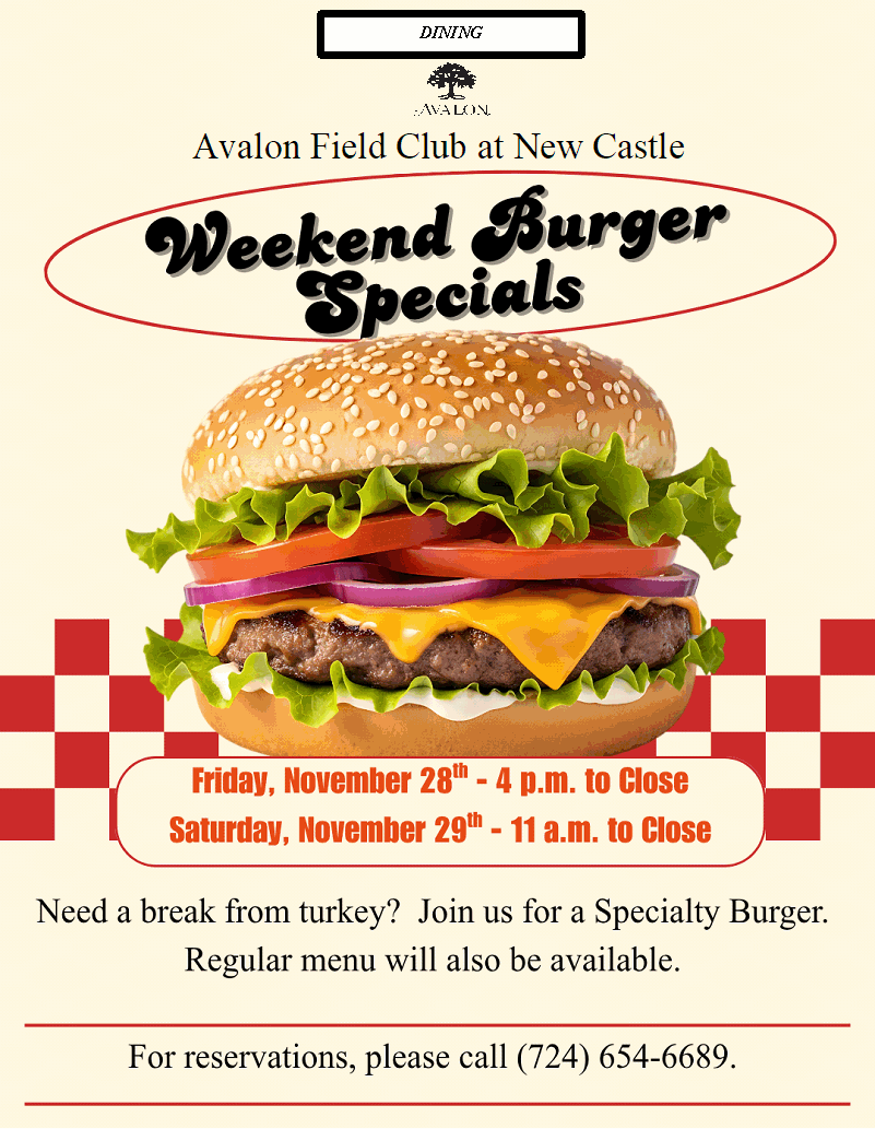 Nov 29 10 Weekend Burger Specials at Avalon Field Club at New Castle By Avalon | Dining November 28th and November 29th Read More