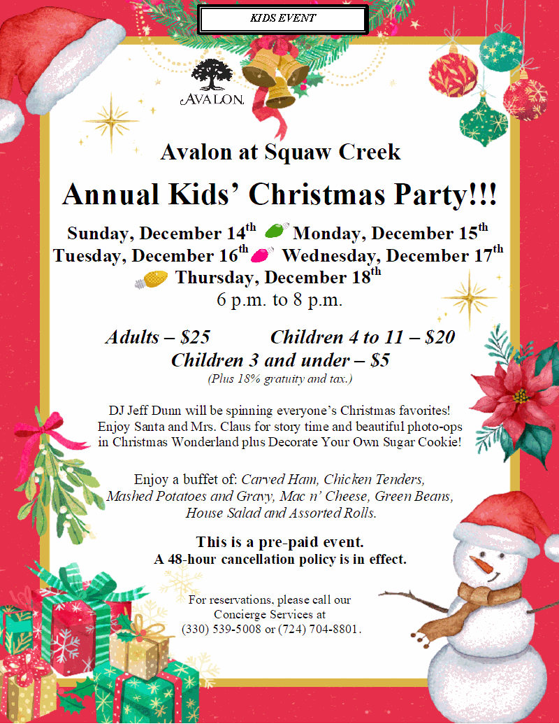 Dec 17 10 Annual Kids’ Christmas Party at Avalon at Squaw Creek By Avalon | Dining, Events / Entertainment, Kids Activities / Childcare Sunday, December 14th through Thursday, December 18th Read More