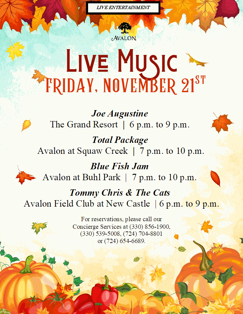 Nov 27 9 Avalon Thanksgiving Hours By Avalon | Cigar, Dining, Events / Entertainment, Fitness, Golf, Kids Activities / Childcare, Spa, Swimming, Tennis, Wine