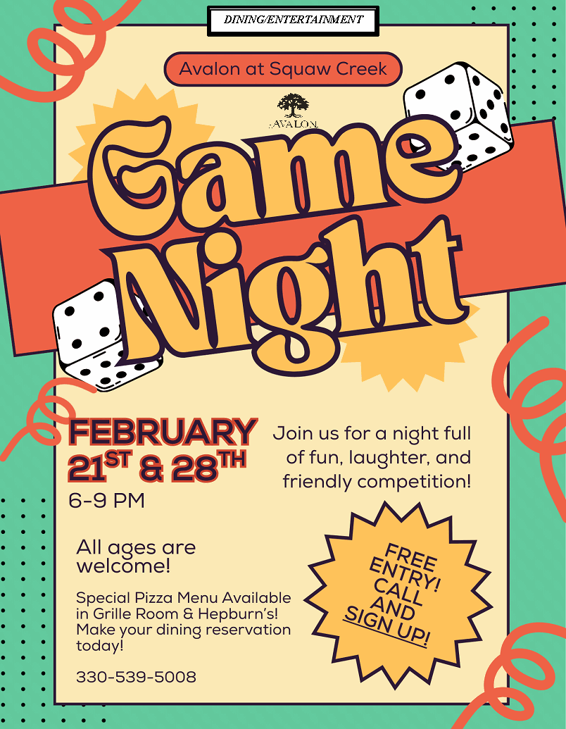 Feb 21 9 Game Night Saturday, February 21st and 28th at Squaw Creek By Avalon | Events / Entertainment