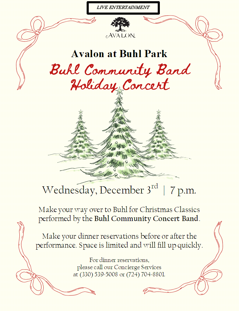 Dec 03 9 Buhl Community Band Holiday Concert Wednesday, December 3rd By Avalon | Dining, Events / Entertainment