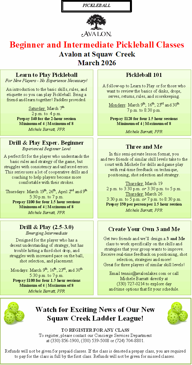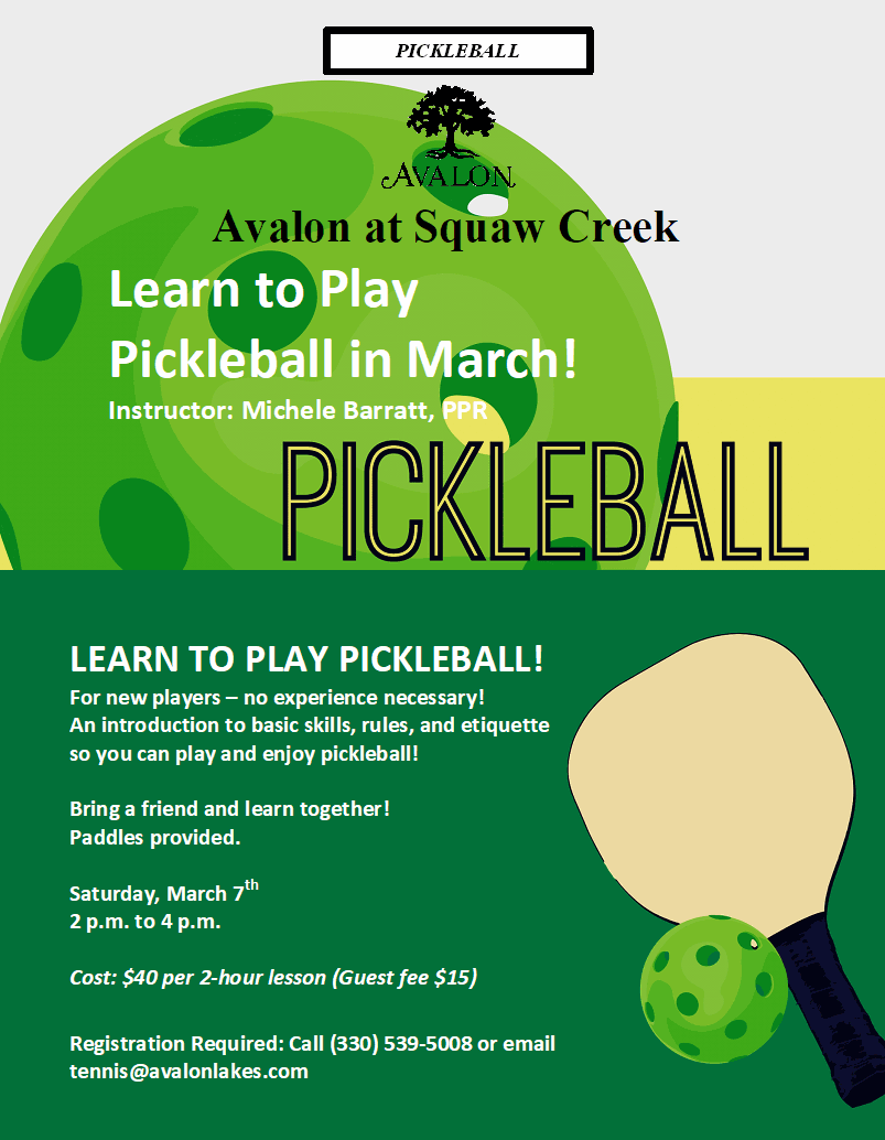 Jan 26 9 January Beginner and Intermediate Pickleball Classes at Avalon at Squaw Creek By Avalon | Tennis