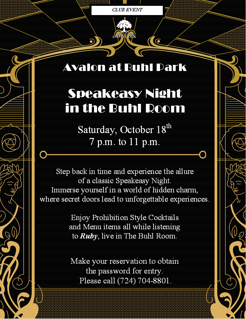 Oct 18 6 Speakeasy Night in the Buhl Room Saturday, October 18th By Avalon | Dining, Events / Entertainment, Wine