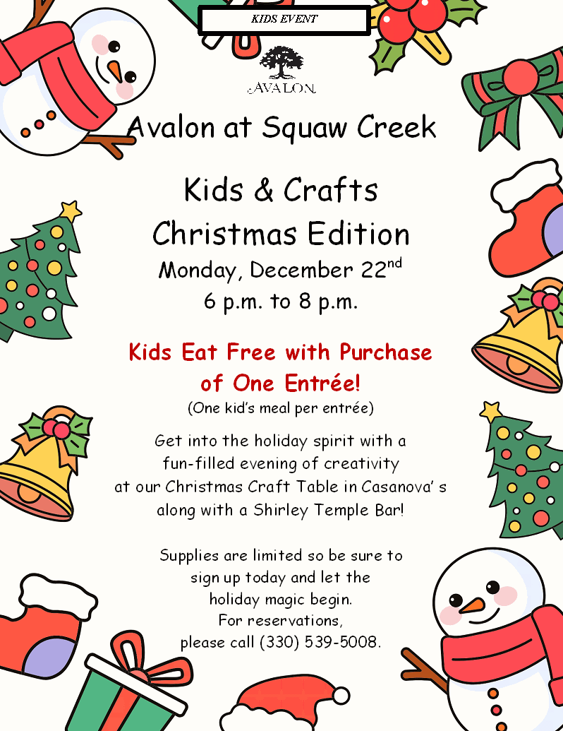 Dec 22 9 Kids and Crafts Christmas Edition Monday, December 22nd at Squaw Creek By Avalon | Dining, Kids Activities / Childcare