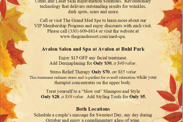 Reserve your Appointment by contacting us at (330) 856-1900 for The Grand Resort’s Grand Spa Suite or (724) 704-8801 for The Salon and Spa at Buhl Park.